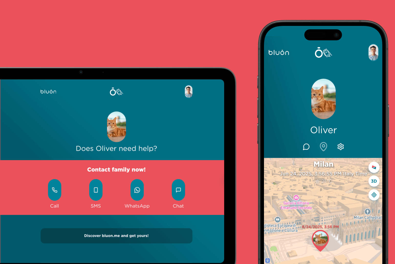Web platform for bluon.me wristbands, designed to reunite lost children or pets with their families. It provides real-time alerts, messaging with finders and automatic notifications to emergency contacts.